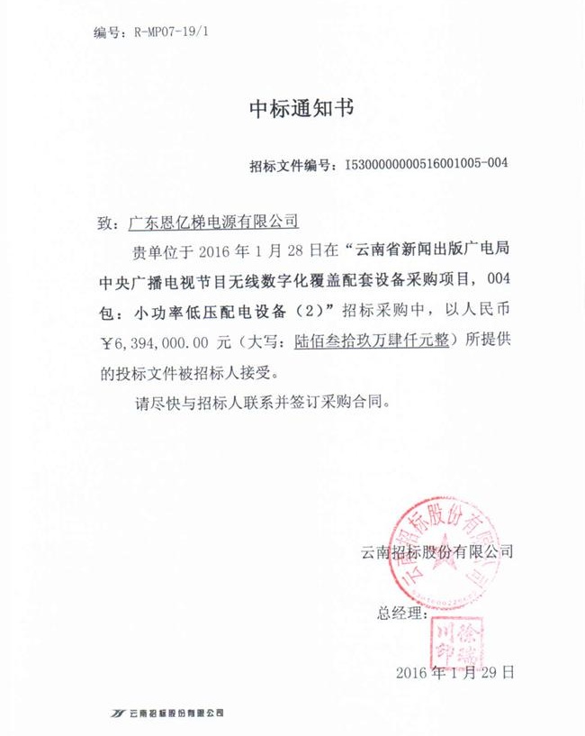恩億梯電源中標(biāo)云南廣電局中央廣播電視配套設(shè)備采購項(xiàng)目